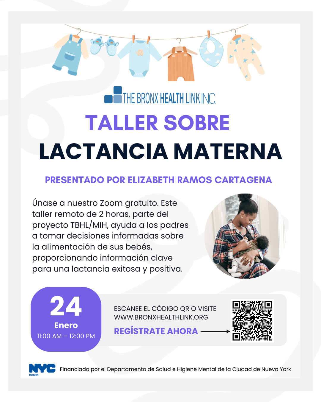 Este taller remoto de 2 horas, que es un proyecto de TBHL/MIH, tiene como objetivo ayudar a los padres a tomar una decisión informada sobre la alimentación de sus bebés, brindándoles a los participantes información clave sobre la lactancia materna. Con un mayor conocimiento y confianza en sí mismos, la lactancia materna puede ser una experiencia positiva y exitosa.