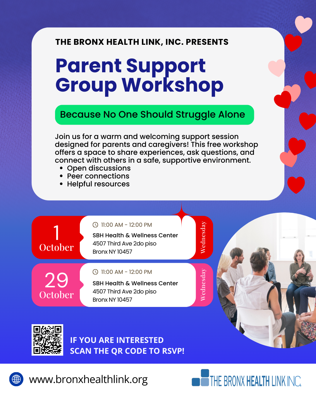 This in-person session will be held on Wednesday, October 01, 2025 and Wednesday, October 29, 2025, from 11:00 AM to 12:00 PM at St. Barnabas Hospital. This gathering is designed to create a safe and welcoming space for parents and caregivers to share their experiences, receive emotional support, and gain access to helpful resources. Whether you're a new parent or navigating the ongoing journey of caregiving, this workshop offers tools, encouragement, and connection with others in your community.