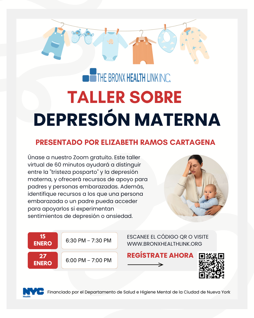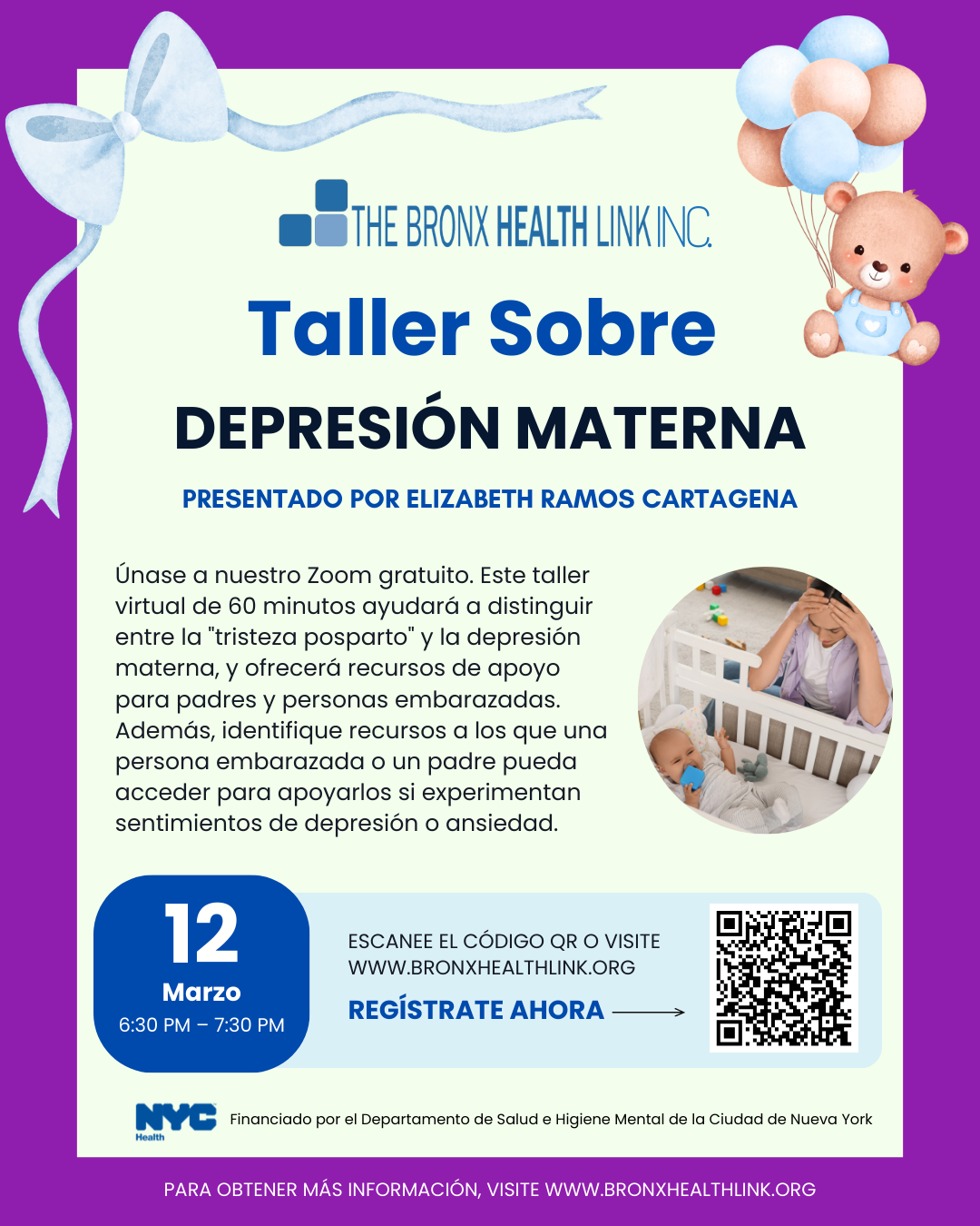 Este taller virtual de 60 minutos ayudará a los participantes a definir la depresión materna y comprender la diferencia entre la "tristeza posparto" y la depresión materna. Además, identifique recursos a los que una persona embarazada o un padre pueda acceder para apoyarlos si experimentan sentimientos de depresión o ansiedad.