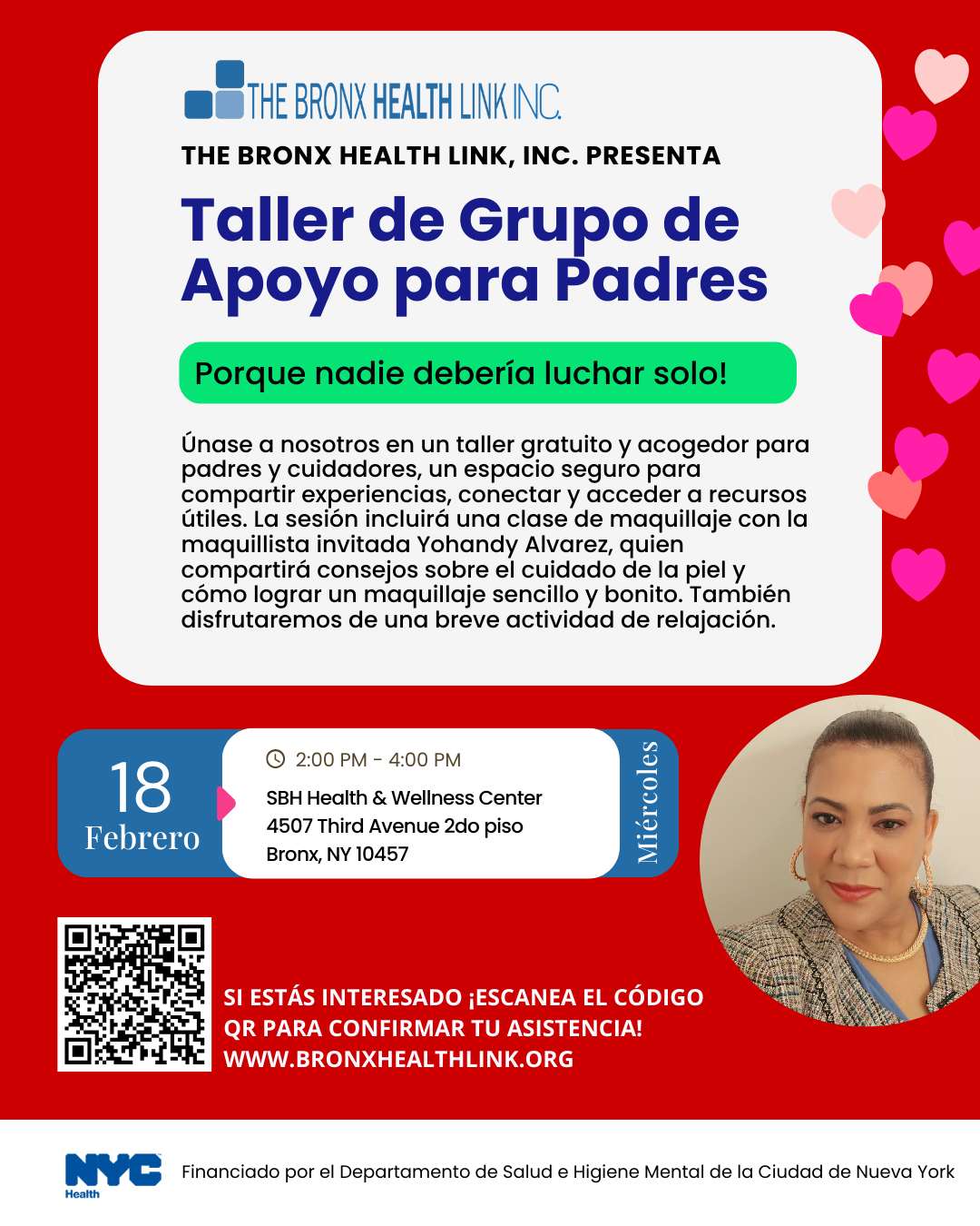 Únase a nosotros en un taller gratuito y acogedor para padres y cuidadores, un espacio seguro para compartir experiencias, conectar y acceder a recursos útiles. La sesión incluirá una clase de maquillaje con la maquillista invitada Yohandy Alvarez, quien compartirá consejos sobre el cuidado de la piel y cómo lograr un maquillaje sencillo y bonito. También disfrutaremos de una breve actividad de relajación.