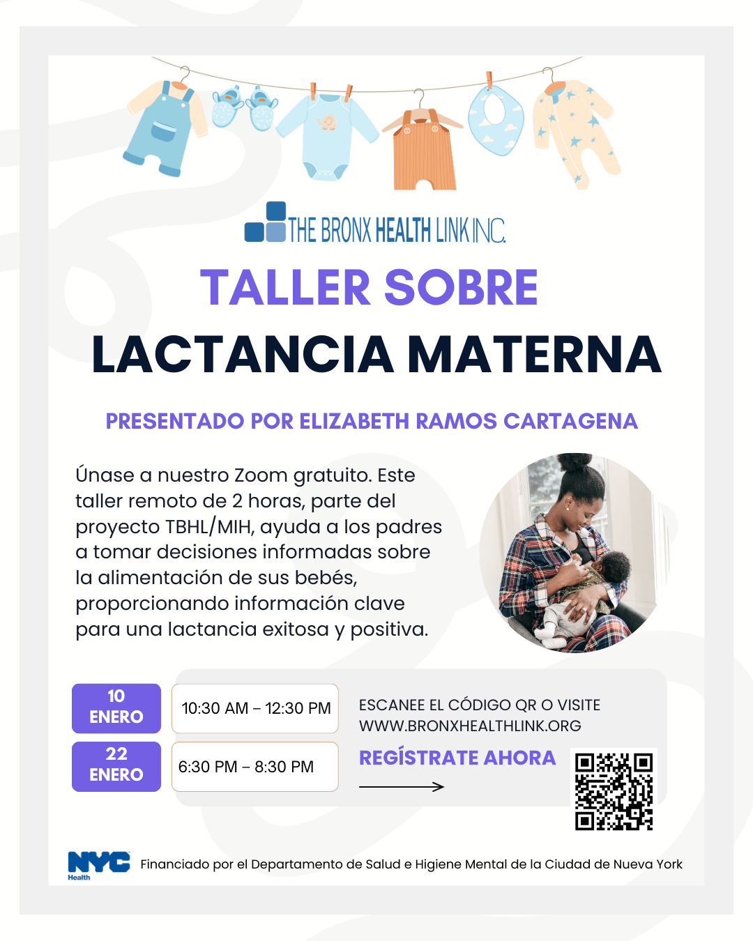 Este taller remoto de 2 horas, que es un proyecto de TBHL/MIH, tiene como objetivo ayudar a los padres a tomar una decisión informada sobre la alimentación de sus bebés, brindándoles a los participantes información clave sobre la lactancia materna. Con un mayor conocimiento y confianza en sí mismos, la lactancia materna puede ser una experiencia positiva y exitosa.