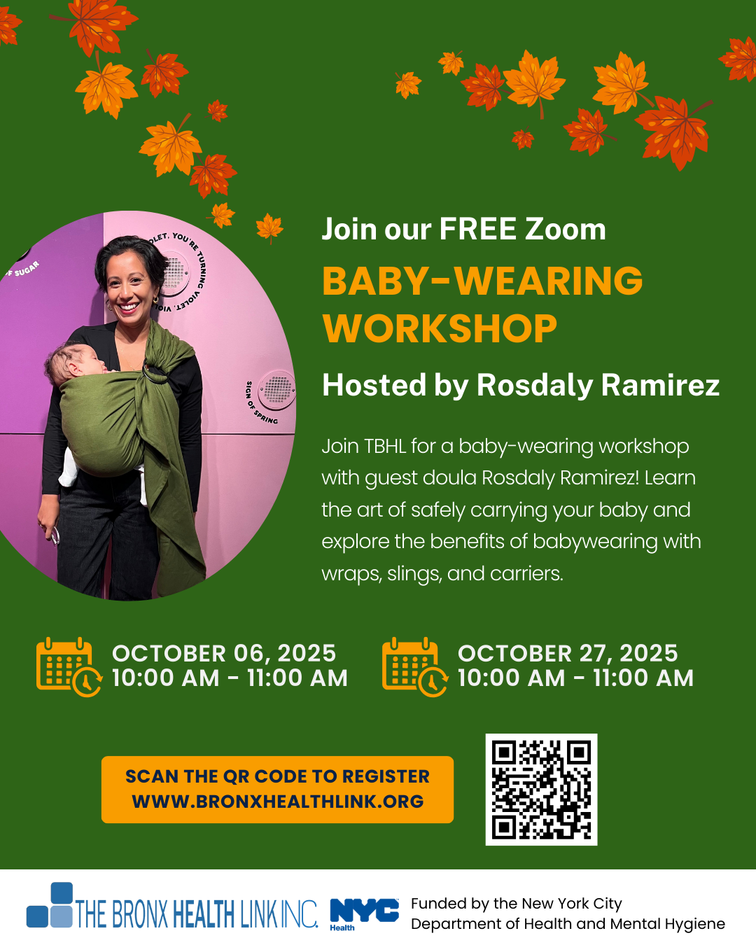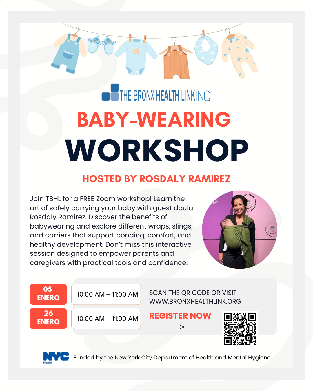 Join TBHL for a baby-wearing workshop with guest doula Rosdaly Ramirez! Learn the art of safely carrying your baby and explore the benefits of babywearing with wraps, slings, and carriers.