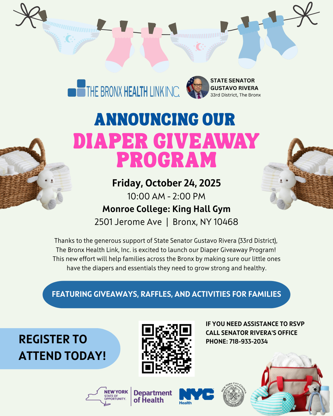 Thanks to the generous support of State Senator Gustavo Rivera (33rd District), The Bronx Health Link, Inc. is excited to launch our Diaper Giveaway Program taking place on Friday , October 24, 2025 from 10:00 AM - 2:00 PM at Monroe College: King Hall Gym 2501 Jerome Ave Bronx, MU 10468. This new effort will help families across the Bronx by making sure our little ones have the diapers and essentials they need to grow strong and healthy.