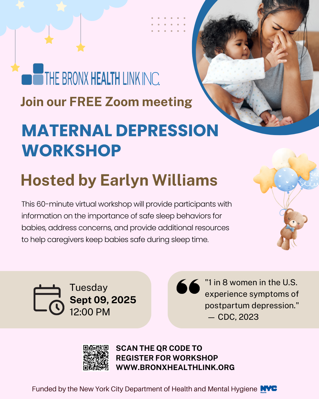 This 60-minute virtual workshop will help participants define maternal depression and understand the difference between the "baby blues" and maternal depression. Additionally, identify resources that a pregnant or parenting person can access to support them if they are experiencing feelings of depression or anxiety.